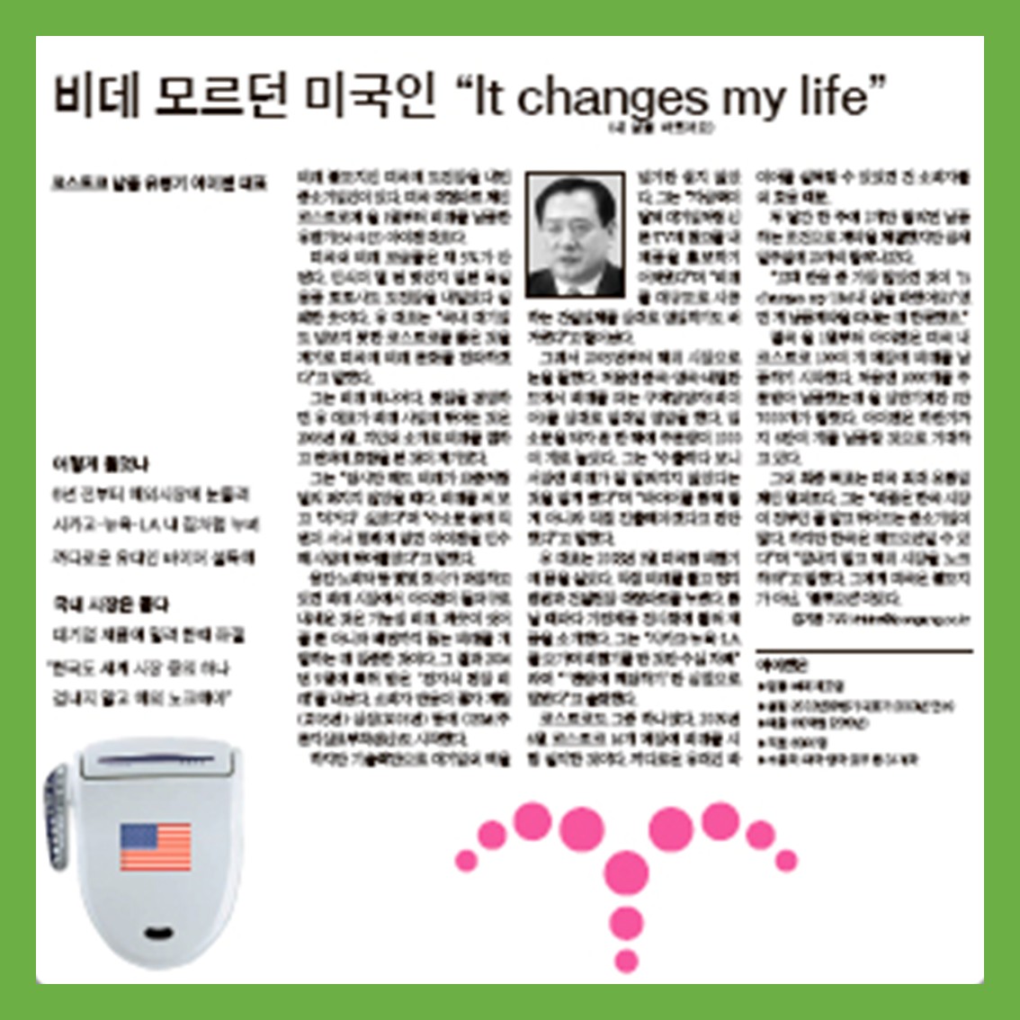 비데 모르던 미국인 “It changes my life”[중앙일보] 입력 2011.07.04 00:06수정 2011.07.04 00:06 비데 불모지인 미국에 도전장을 내민 중소기업인이 있다. 미국 대형마트 체인 코스트코에 올 1월부터 비데를 납품한 유병기(54·사진) 아이젠 대표다. 미국의 비데 보급률은 채 5%가 안 된다. 인식이 덜 된 탓인지 일본 욕실용품 토토사도 도전장을 내밀었다 실패한 곳이다. 유 대표는 “국내 대기업도 넘보지 못한 코스트코를 뚫은 것을 계기로 미국에 비데 문화를 전파하겠다”고 말했다. 그는 비데 매니어다. 횟집을 경영하던 유 대표가 비데 사업에 뛰어든 것은 2003년 1월. 지인의 소개로 비데를 접하고 변비에 효험을 본 것이 계기였다. 그는 “당시만 해도 비데가 요즘처럼 널리 퍼지지 않았을 때다. 비데를 써 보고 ‘이거다’ 싶었다”며 “수소문 끝에 직원이 서너 명밖에 없던 아이젠을 인수해 사업에 뛰어들었다”고 말했다. 웅진·노비타 등 몇몇 회사가 과점하고 있던 비데 시장에서 아이젠이 돌파구로 내세운 것은 기능성 비데. 깨끗이 씻어줄 뿐 아니라 배변까지 돕는 비데를 개발하는 데 집중한 것이다. 그 결과 2004년 9월에 특허 받은 ‘전자식 관장 비데’를 내놨다. 소비자 반응이 좋자 계림(2005년)·삼성(2006년) 등에 OEM(주문자상표부착생산)도 시작했다. 하지만 기술력만으로 대기업의 벽을 넘기란 쉽지 않았다. 그는 “자금력이 달려 대기업처럼 신문·TV에 광고를 내 제품을 홍보하기 어려웠다”며 “비데를 대규모로 시공하는 건설업체를 상대로 영업하기도 버거웠다”고 털어놨다. 그래서 2005년부터 해외 시장으로 눈을 돌렸다. 처음엔 중국·영국·네덜란드에서 비데를 파는 구매담당자(바이어)를 상대로 일대일 영업을 했다. 입소문을 타자 곧 한 해에 주문량이 1000여 개로 늘었다. 그는 “수출하다 보니 서양엔 비데가 잘 알려지지 않았다는 것을 알게 됐다”며 “바이어를 통해 팔 게 아니라 직접 진출해야겠다고 판단했다”고 말했다. 유 대표는 2008년 3월 미국행 비행기에 몸을 실었다. 직접 비데를 들고 현지 병원과 건설현장·대형마트를 누볐다. 틈날 때마다 가전제품 전시회에 들러 제품을 소개했다. 그는 “시카고·뉴욕·LA를 오가며 비행기를 탄 것만 수십 차례”라며 “‘맨땅에 헤딩하기’란 심정으로 덤볐다”고 술회했다. 코스트코도 그중 하나였다. 2009년 6월 코스트코 14개 매장에 비데를 시험 설치한 것이다. 까다로운 유대인 바이어를 설득할 수 있었던 건 소비자들의 호응 때문. 두 달간 한 주에 2개만 팔리면 납품하는 조건으로 계약을 체결했지만 금세 일주일에 20개씩 팔려나갔다. “고객 반응 중 가장 많았던 것이 ‘It changes my life(내 삶을 바꿨어요)’였던 게 납품계약을 따내는 데 한몫했죠.” 결국 올 1월부터 아이젠은 미국 내 코스트코 100여 개 매장에 비데를 납품하기 시작했다. 처음엔 1000개를 주문받아 납품했는데 올 상반기에만 1만7000개가 팔렸다. 아이젠은 하반기까지 6만여 개를 납품할 것으로 기대하고 있다. 그의 최종 목표는 미국 최대 유통업체인 월마트다. 그는 “비좁은 한국 시장이 전부인 줄 알고 뛰어드는 중소기업이 많다. 하지만 한국은 레드오션일 수 있다”며 “겁내지 말고 해외 시장을 노크하라”고 말했다. 그에게 미국은 불모지가 아닌, ‘블루오션’이었다. 김기환 기자 (주)아이젠은 ▶업종 : 비데 제조업 ▶설립 : 2002년(유병기 대표가 2003년 인수) ▶매출 : 110억원 (2010년) ▶직원 : 60여 명 ▶수출국 : 미국·영국·호주 등 34개국