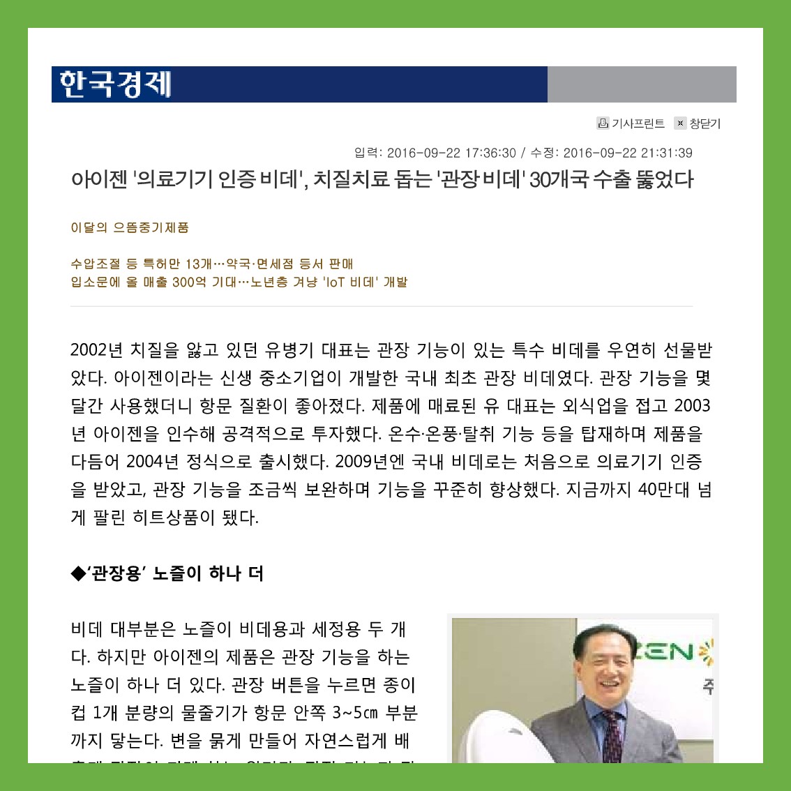 [한국경제] 아이젠 '의료기기인증비데', 치질치료 돕는 '관장비데' 30개국 수출 뚫었다