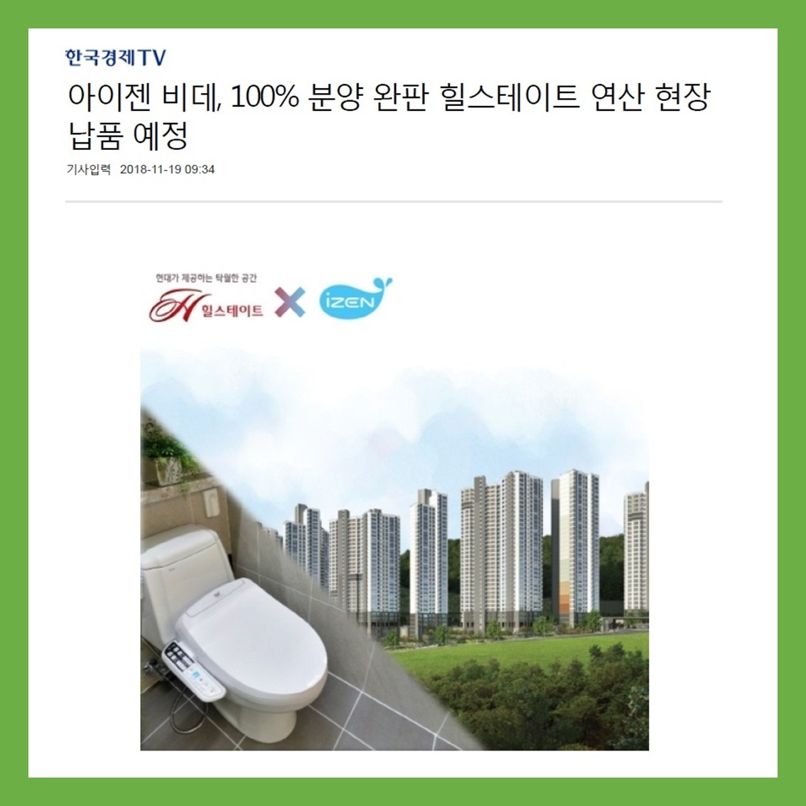 [한국경제TV] 아이젠 비데, 100% 분양 완판 힐스테이트 연산 현장 납품 예정