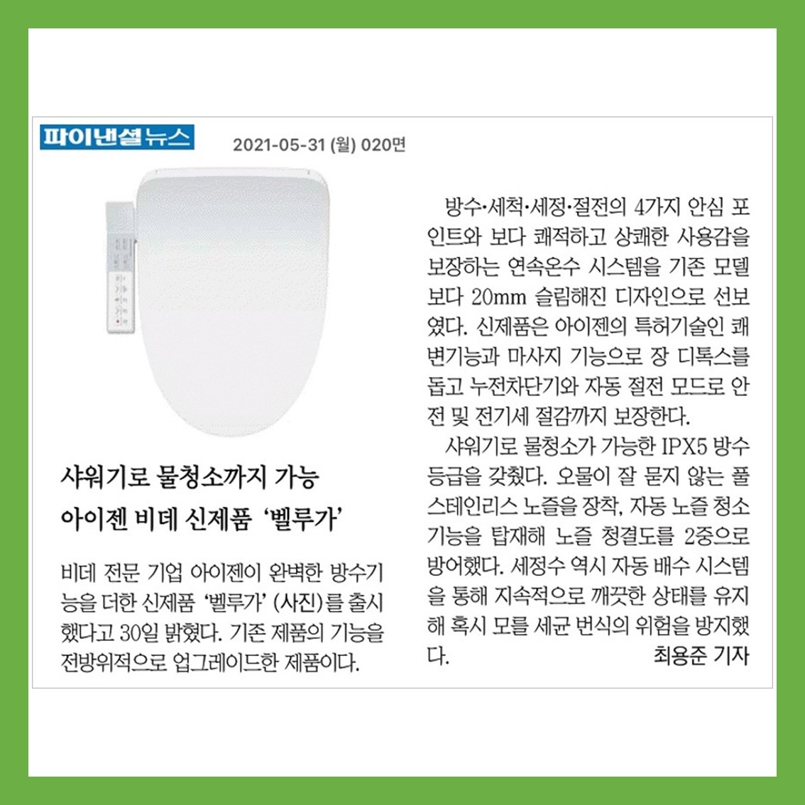 [파이낸셜뉴스]샤워기로 물청소까지 가능 아이젠 비데 신제품 '벨루가'
